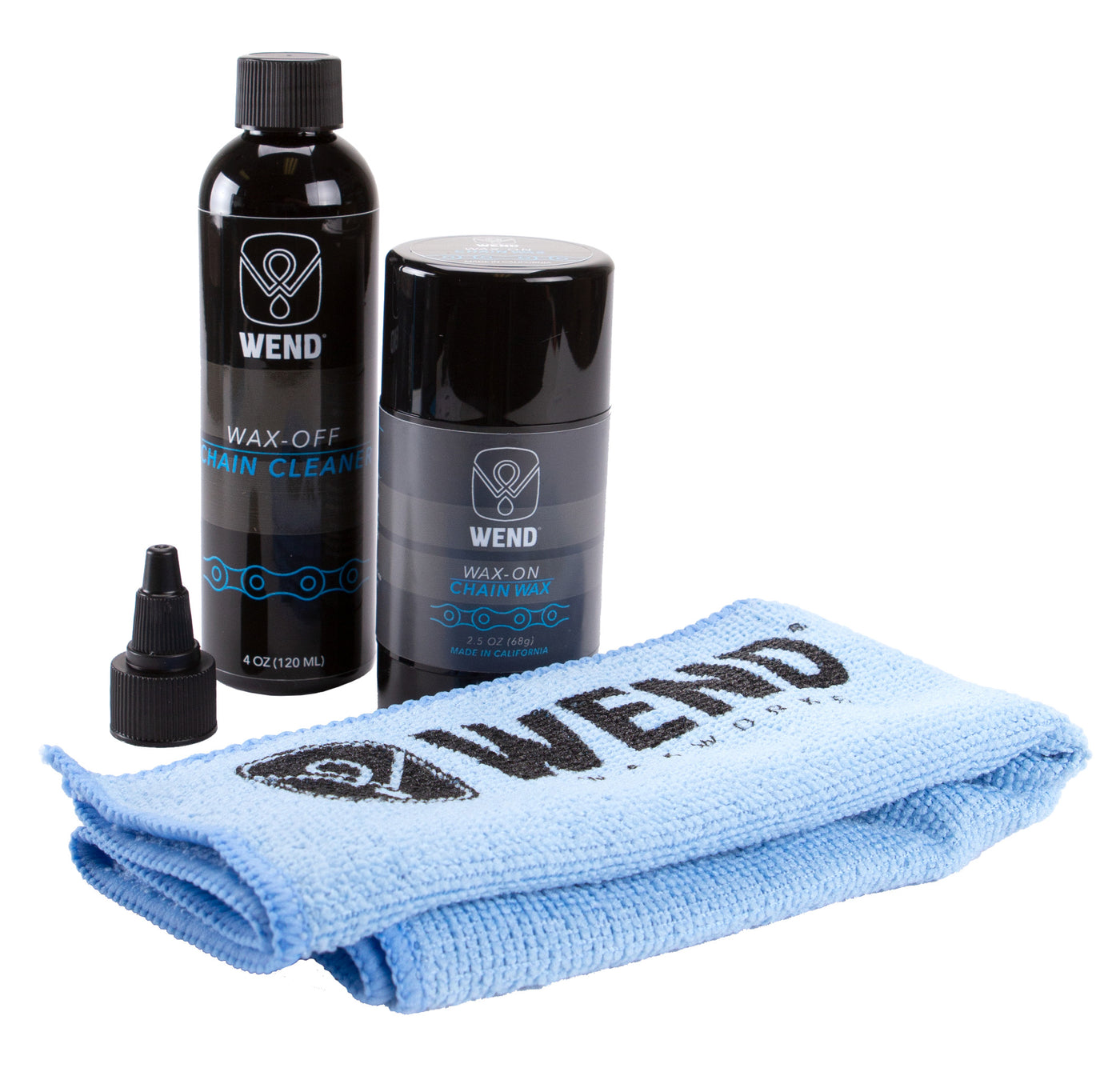 Kit contains: one 2.5oz tube of wax paste, one 4oz bottle of Wax-Off natural chain cleaner and one Wend microfiber towel