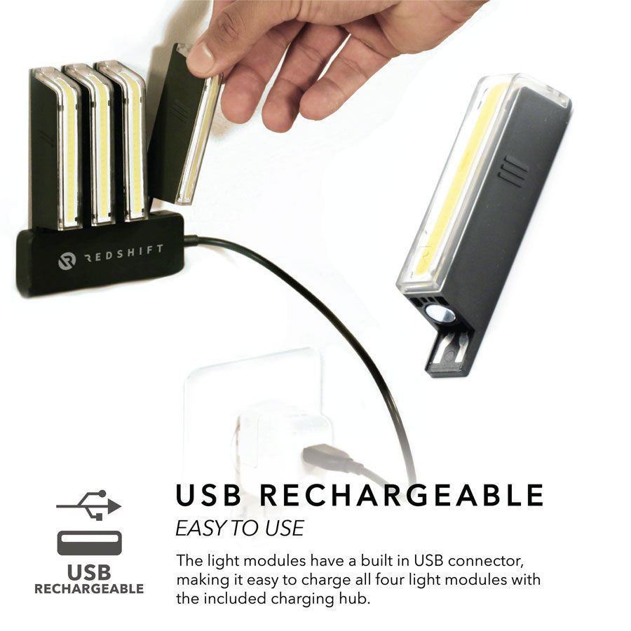 The Light Modules have a built-in USB plug for easy charging on any standard USB charger or with the included 4-place charging hub