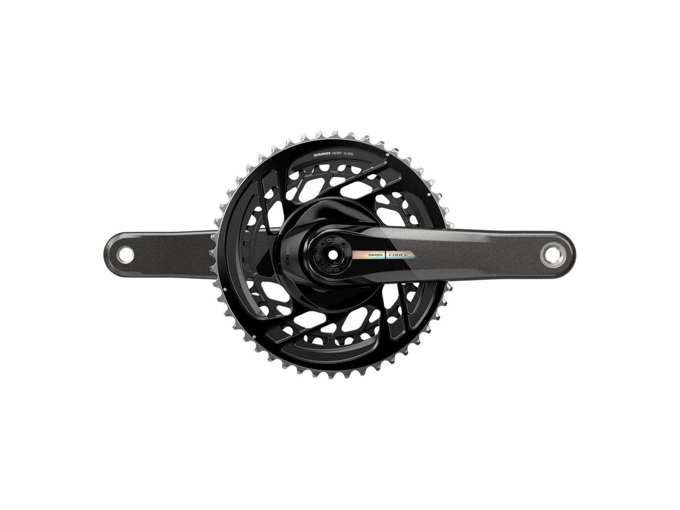 SRAM Force Crankset - 172.5mm 2x 12-Speed 50/37t Direct Mount DUB Spindle Interface Iridescent Gray D2. The SRAM Force carbon 2x crankset is the very center of the X-Range gearing philosophy. With tight 13-tooth gaps between chainrings paired to wide-range cassettes riders get more range while shifting less frequently and staying in the big ring longer. Previously only available on RED SRAMs integrated chainrings are light stiff and incredibly durable. The black finish mated to dazzling glossy carbon arms will elevate any bike.X-Range gearing technology gives you more range and a smoother gear progression so you’re always in the right gear