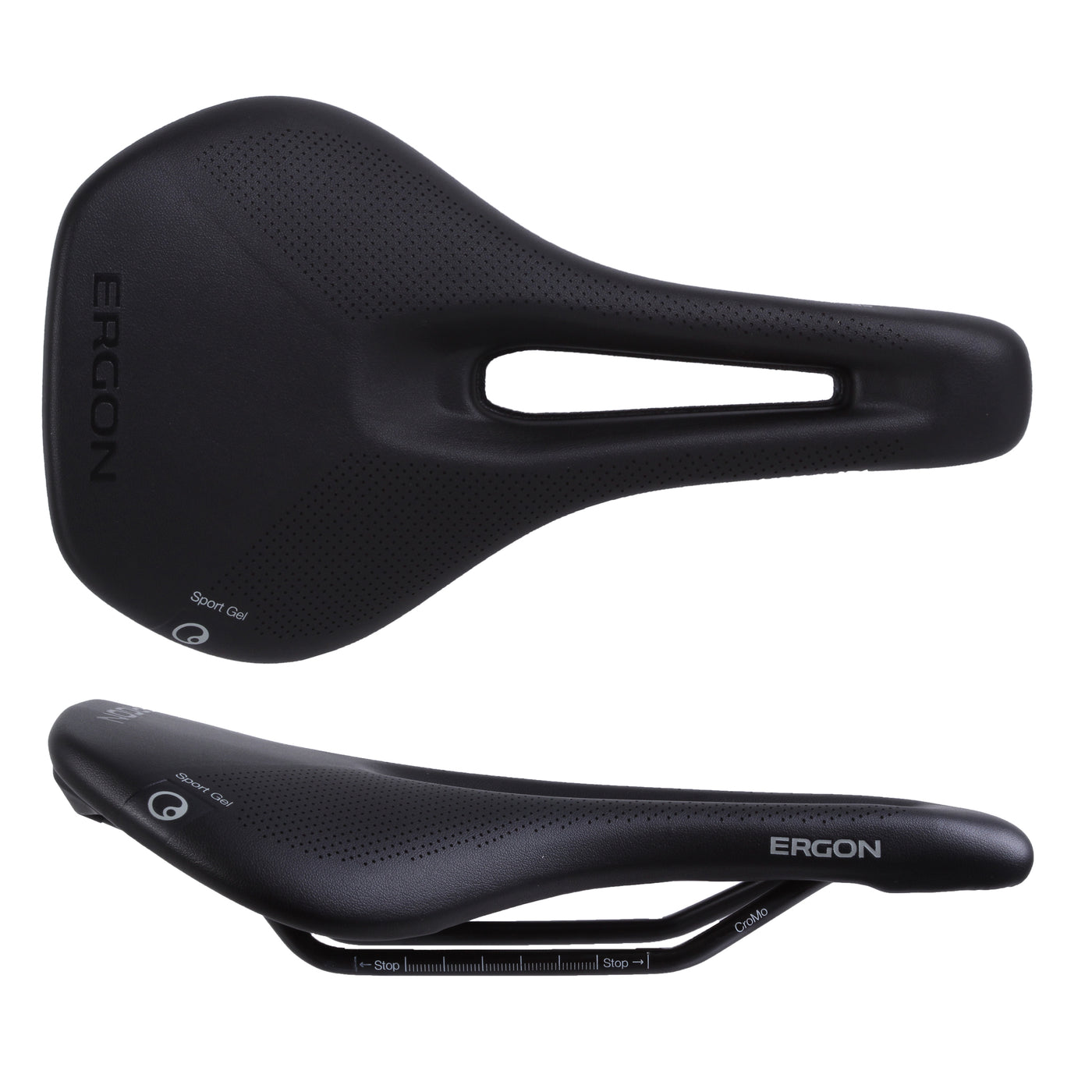 Ergon SR Sport Gel Saddle and Tape - Chromoly Black Womens Medium/Large. SR Road bike saddle specifically for Women. Flat but still comfortably padded. Shape and relief exactly fit the female anatomy in the typical racing-related sitting position. The genital and seating areas are noticeably relieved by means of large gel pads.Pressure Relief Inlays-Gel inlays in the sit and genital areas distributing sitting pressure in new ways