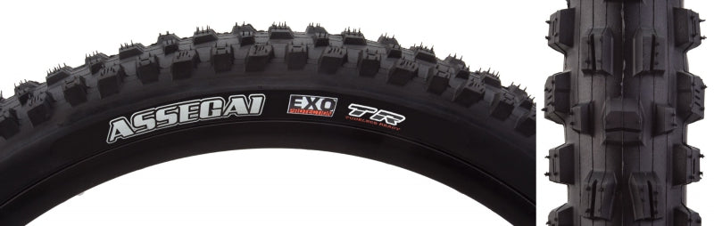 Maxxis Assegai Tire - 29 x 2.6 Tubeless Folding Black Dual EXO Wide Trail. The Assegai tire is designed primarily for downhill racing and aggressive trail riding in mixed conditions. The knob height falls between the Minion DHR II and the Shorty. Like the Minion tires the center knobs are heavily ramped on the leading edge to reduce rolling resistance. A small knob located between the center tread and side knobs provides a smooth transition while cornering. The Assegai offers predictable traction even over slippery roots and rocks.World Cup Champion Greg Minnaars signature tire