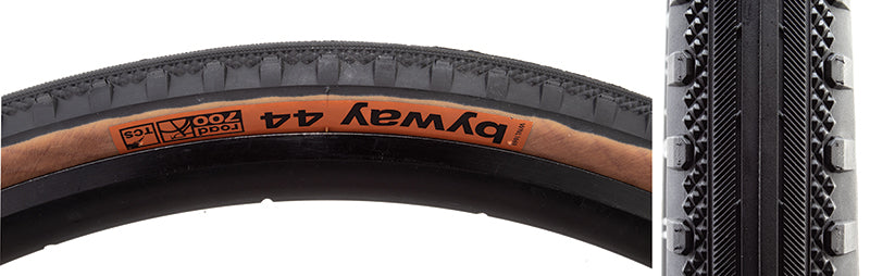 WTB Byway Tire - 700 x 44 TCS Tubeless Folding Black/Tan. The Byway Road Plus tire allows riders to find comfort on remote gravel roads without being slowed down on the pavement required to reach them. Staying true to its road usage a slick centerline borders angular hatching to keep everything smooth on sections of pavement. Intermediate diamond-shaped peaks provide steadfast traction under power while consistent and more substantial knobs extend down the side to protect it against ill-intentioned rocks or gashes while exploring new areas.Road Plus TCS: Sealant optimized lightweight casing with folding TCS aramid bead and Dual Compound DNA rubber