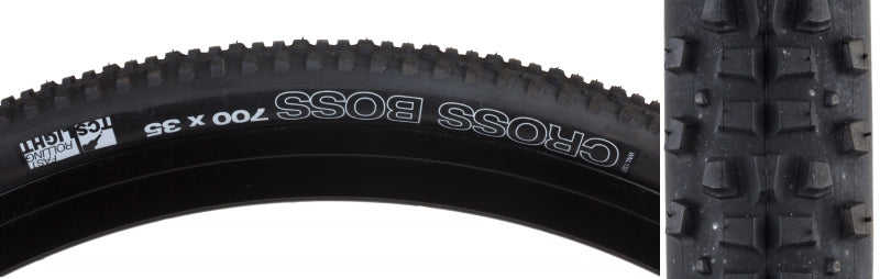WTB Cross Boss Tire - 700 x 35 TCS Tubeless Folding Black Light Fast Rolling. Volume speed and consistency. The Cross Boss’ even center tread shelf provides smooth and fast acceleration while more open side knobs help clear muck. A rounded high volume profile designed ground-up for tubeless usage provides plenty of room to modulate tire pressure while dual compound Dual DNA rubber and defined cornering channels keep riders grinning for more turns. From single track to the circuit the Cross Boss is here to bring it.Tightly spaced center knobs minimize rolling resistance