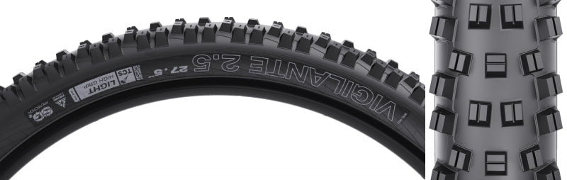 WTB Vigilante Tire - 27.5 x 2.5 TCS Tubeless Folding Black Light/High Grip TriTec SG2. Born from the need to race in European enduro events the Vigilante is WTBs premier aggressive All Mountain tire. The square-lugged open tread pattern offers stability in loose or wet terrain while the stiff outside knobs grip at lean angles like nobody’s business. With Dual DNA rubber or Gravity DNA options this is the tire to ride when you are giving it your all.Often used as an aggressive front tire though it also works well as a rear tire on loose steep terrain